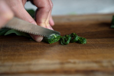 While that cooks, let's move on to preparing the collard greens that will be added to the soup at the very end. Clean the leaves and place and individual leaf on a cutting board. Take your knife and cut away the stem. Do this to 2-3 leaves and then stack on top of each other and roll the leaves tightly as if your rolling a cigar. Take a serrated knife and cut very thin slices into the rolled collard greens. Set cut rolls aside and finish the rest of the batch of collard greens. You can also use Tuscan kale which can give a nice flavor to your Caldo Verde.